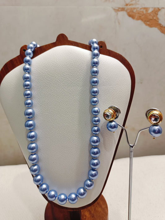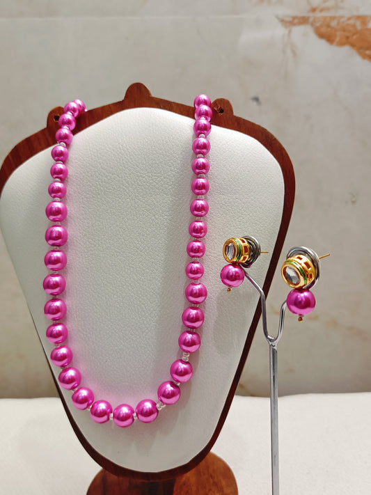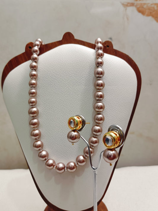 Grey Pink White Pearl Necklace With Golden Metal Earrings