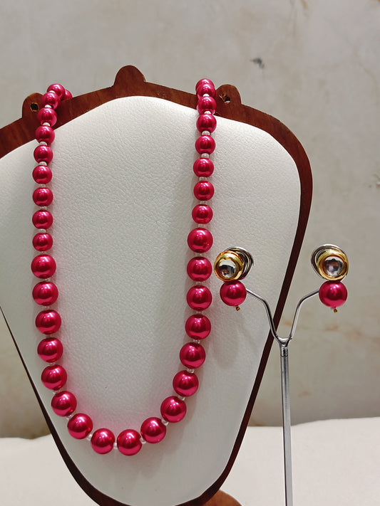 Bright Red Pearl Necklace With Golden Metal Earrings