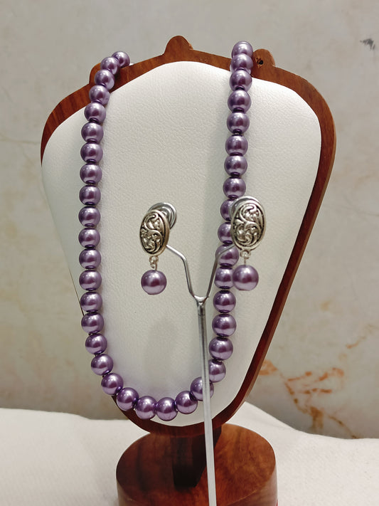 Purple Pearls Necklace With Oxidised Silver Earrings