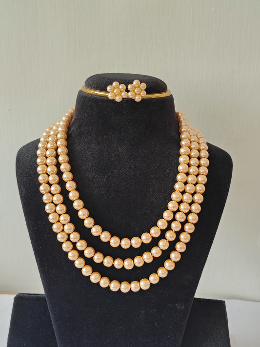 3 Layer Pearl Necklace Set Golden Shade With Earrings
