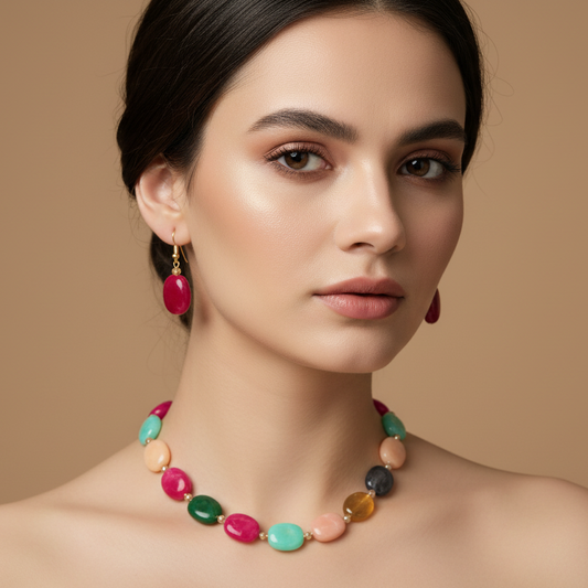 Green Red Gold-Plated Choker & Jhumka Jewelry Set With Earrings