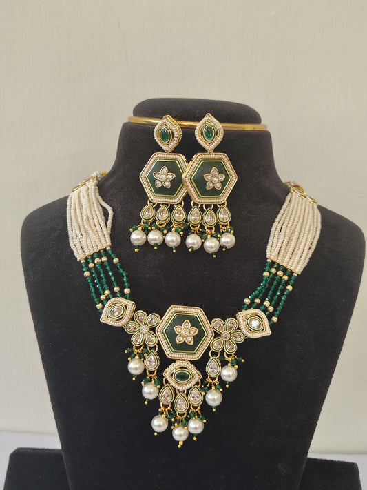 Green& White Premium Meenakari & Pearl Statement Jewellery With Earrings
