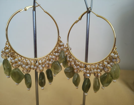 Premium Green Shade Pearls With Golden Metal Earrings
