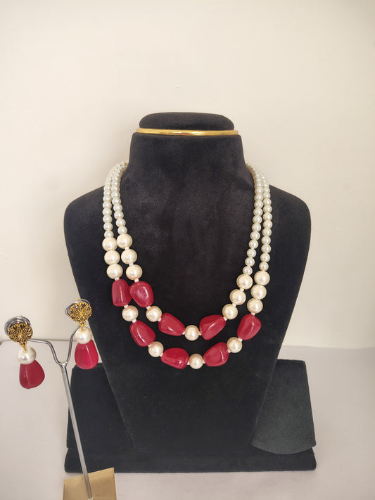 Red White Pearl Necklace With Earrings