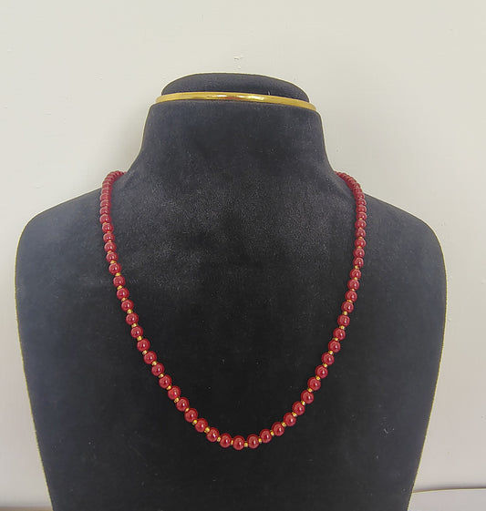 Bright Red Pearl Necklace With Golden Metal Earrings