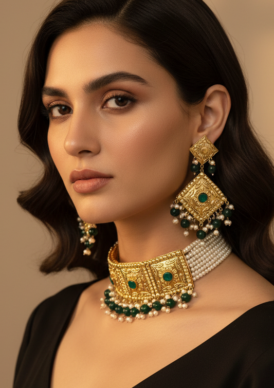 Royal Emerald & Gold Filigree Choker Set with Matching Maang Tikka and Earrings
