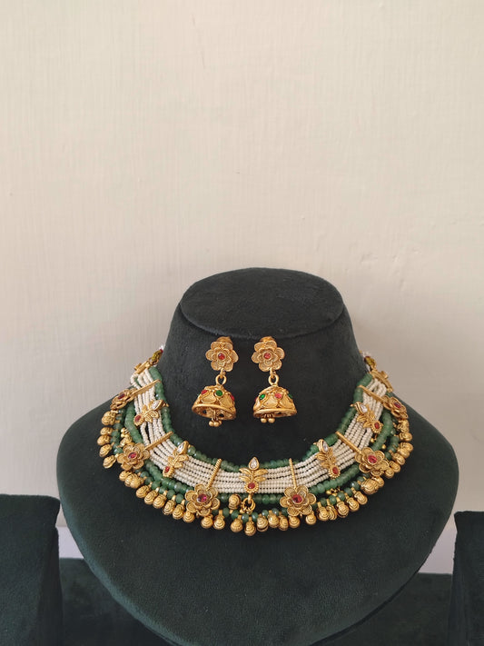 Green Golden Shade Emerald & Pearl Choker with Earrings