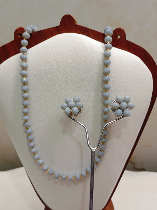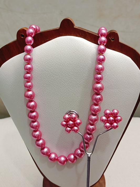 Grey Pink White Pearl Necklace With Golden Metal Earrings
