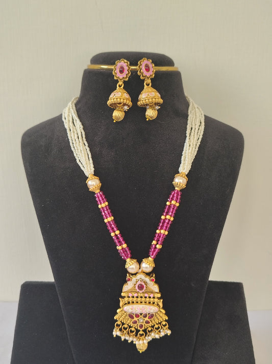 Maroon Stone & Golden Shade Pearl Necklace With Earrings