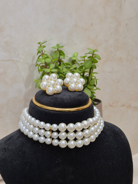 Classic White Three-Strand Pearl Necklace & Earring Set