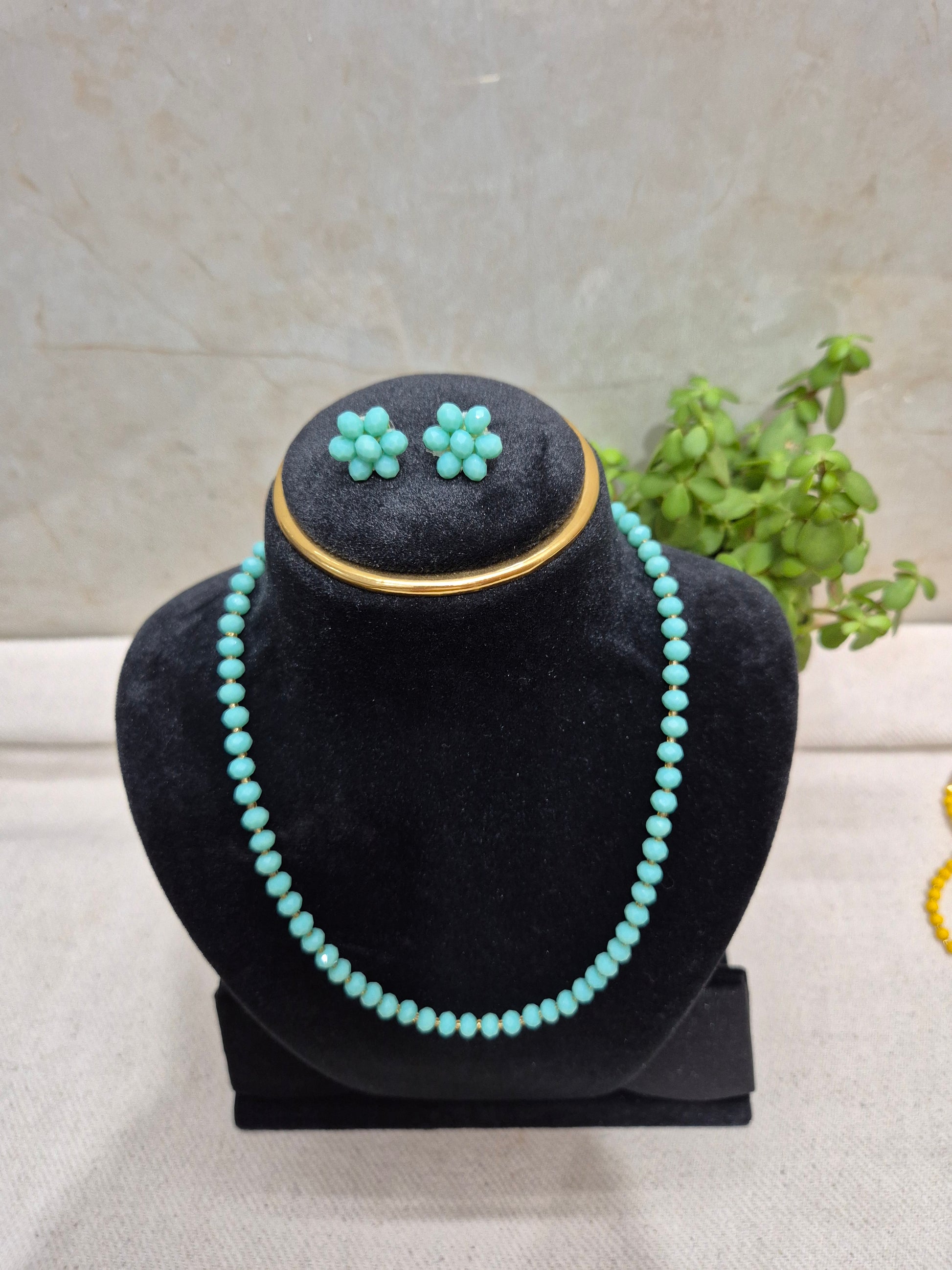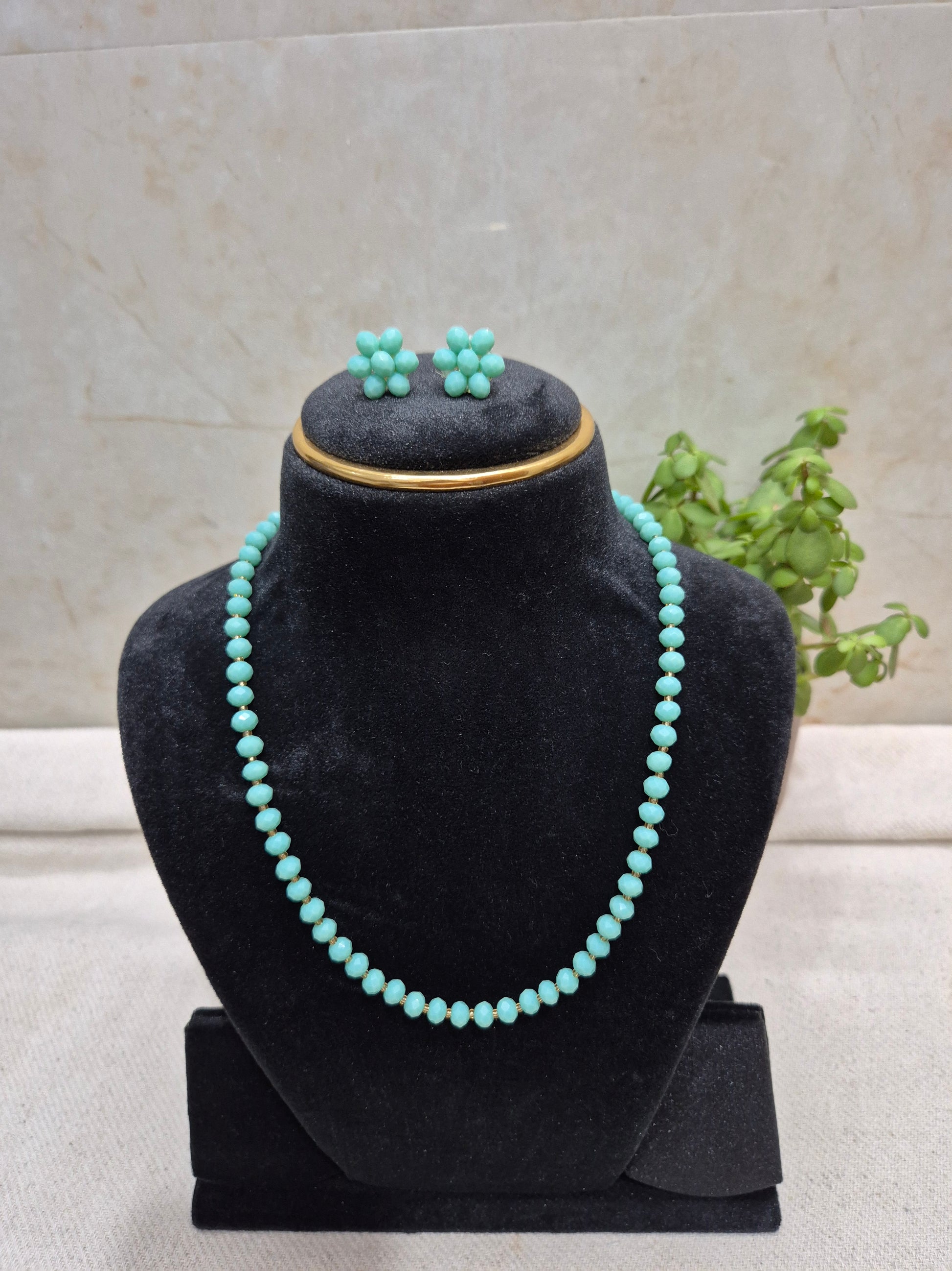 The set is completed with a pair of charming stud earrings, fashioned into a lovely flower shape using smaller matching aqua blue beads. This versatile set is ideal for adding a cheerful pop of color to your everyday outfits, enhancing your spring or summer wardrobe, or gifting to someone special.