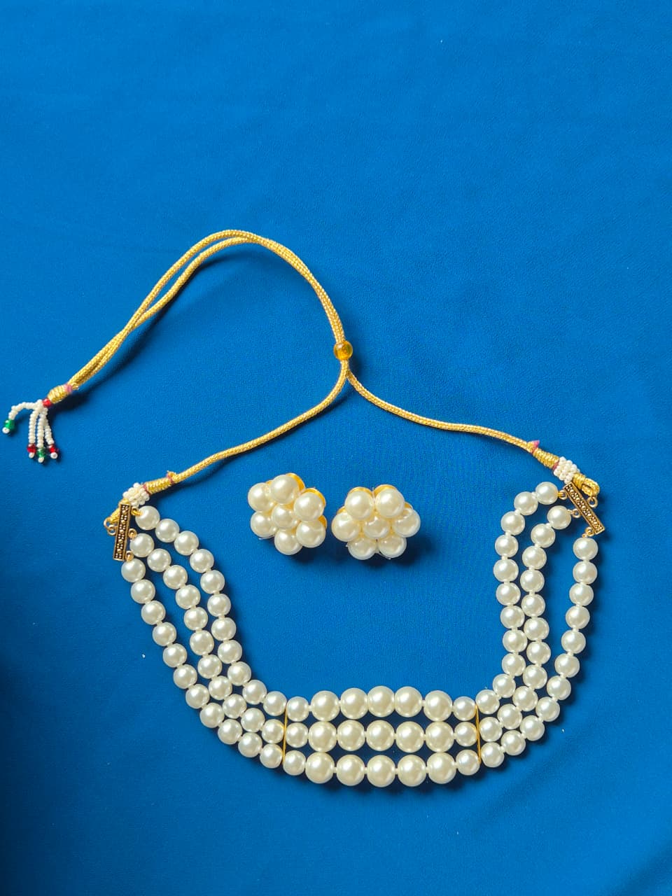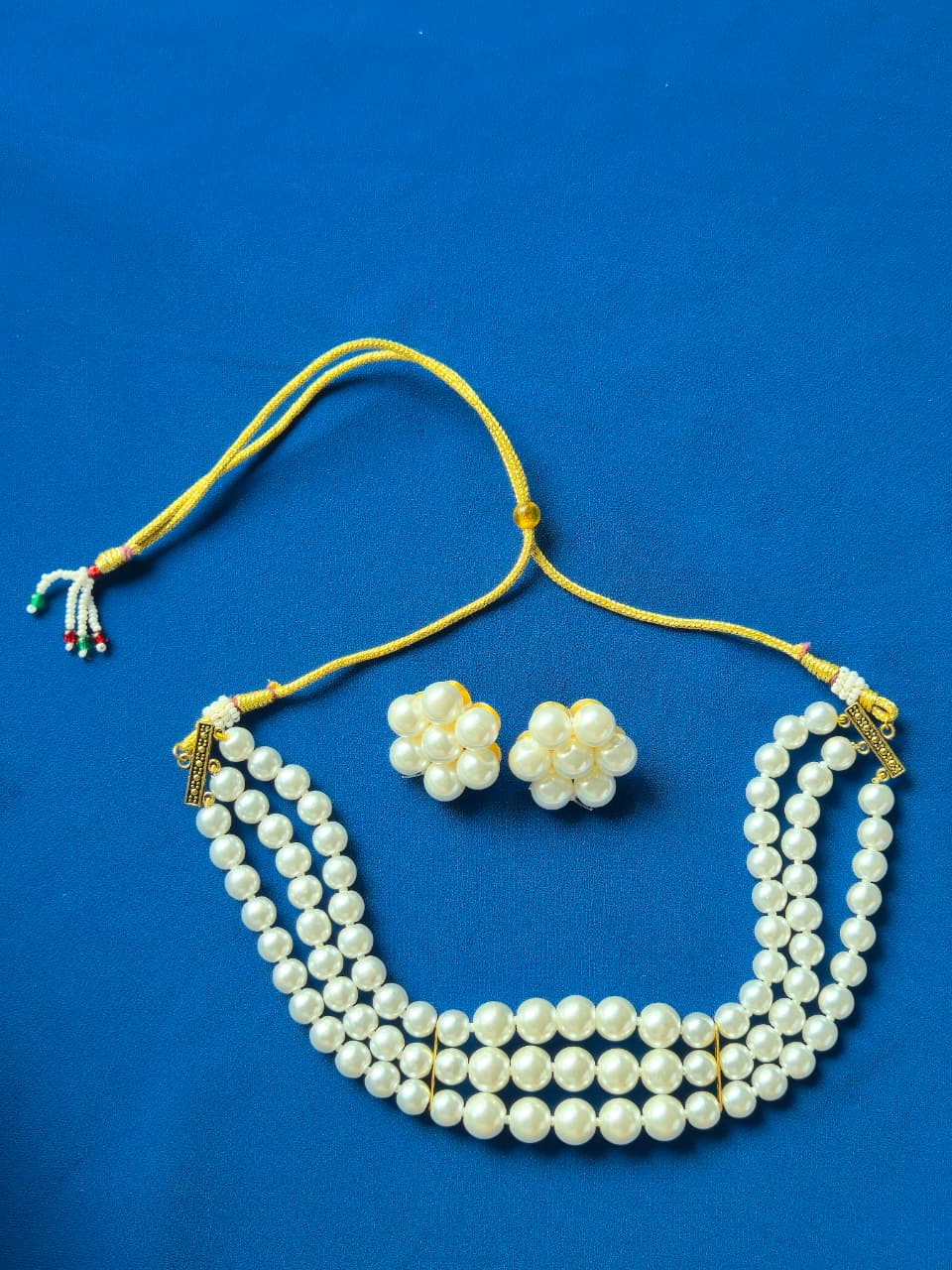 The set includes a matching pair of flower-shaped stud earrings, each crafted with delicate pearls that perfectly complement the necklace. This versatile jewelry set is a must-have for any wardrobe, ideal for adding a classic touch to a wedding gown, a formal dress, or even to elevate your everyday attire. The adjustable yellow thread closure ensures a comfortable and customizable fit.