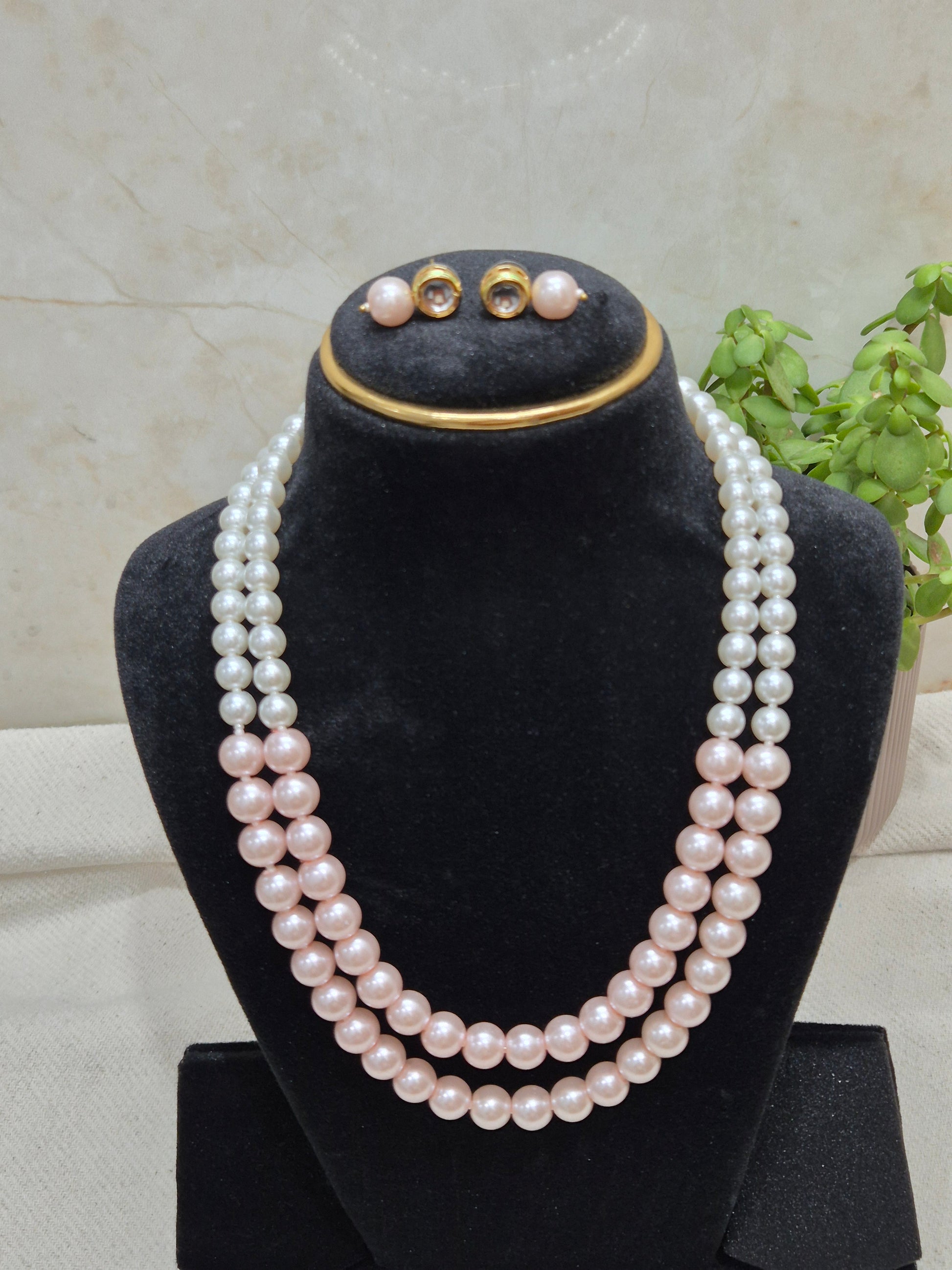 Discover timeless elegance with a modern twist in this beautiful two-strand pearl jewelry set. The necklace features a sophisticated blend of creamy white pearls on the upper strand, gracefully transitioning to soft blush pink pearls on the lower strand. This unique dual-tone design creates a chic, layered look that is both classic and contemporary.