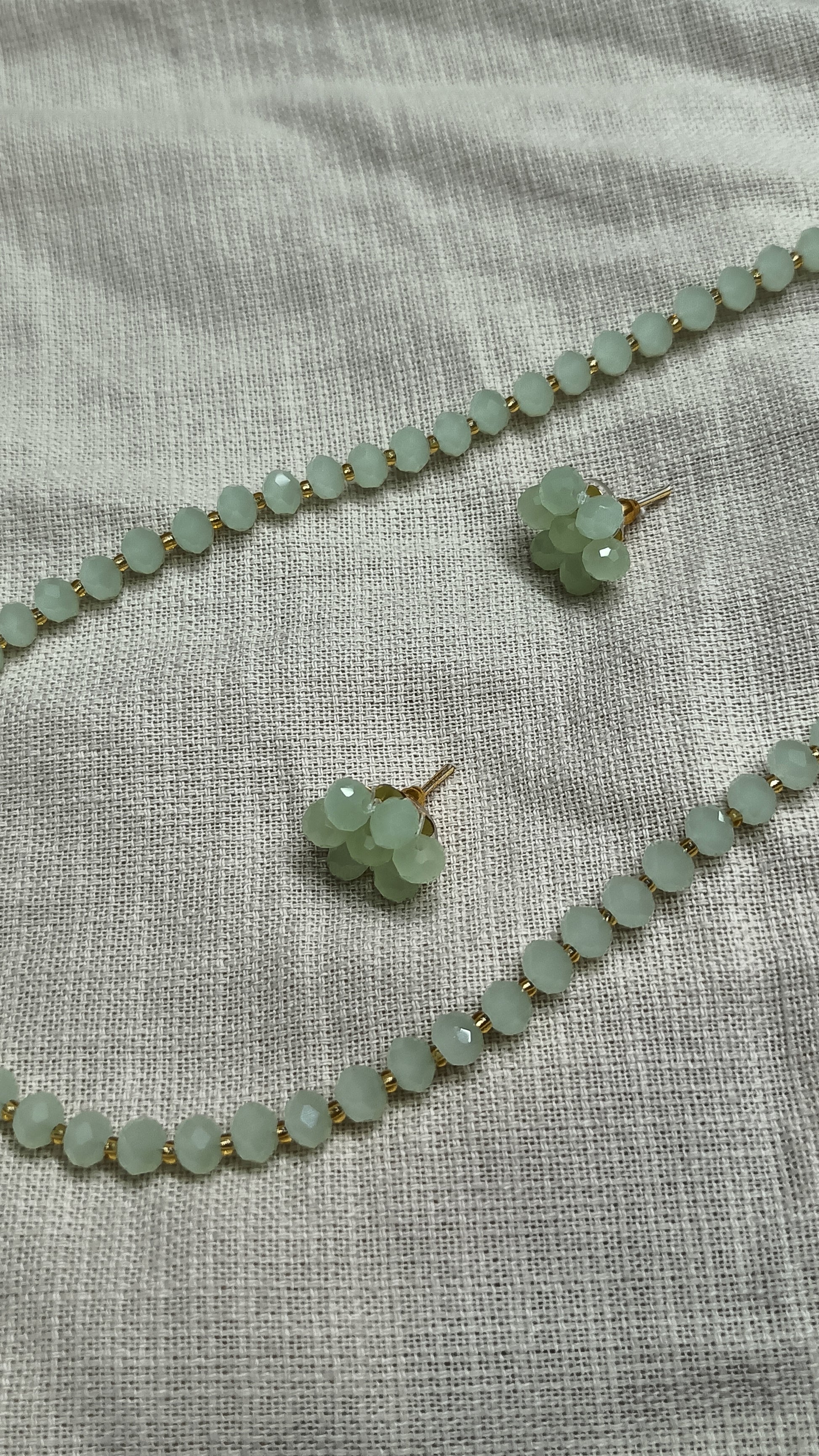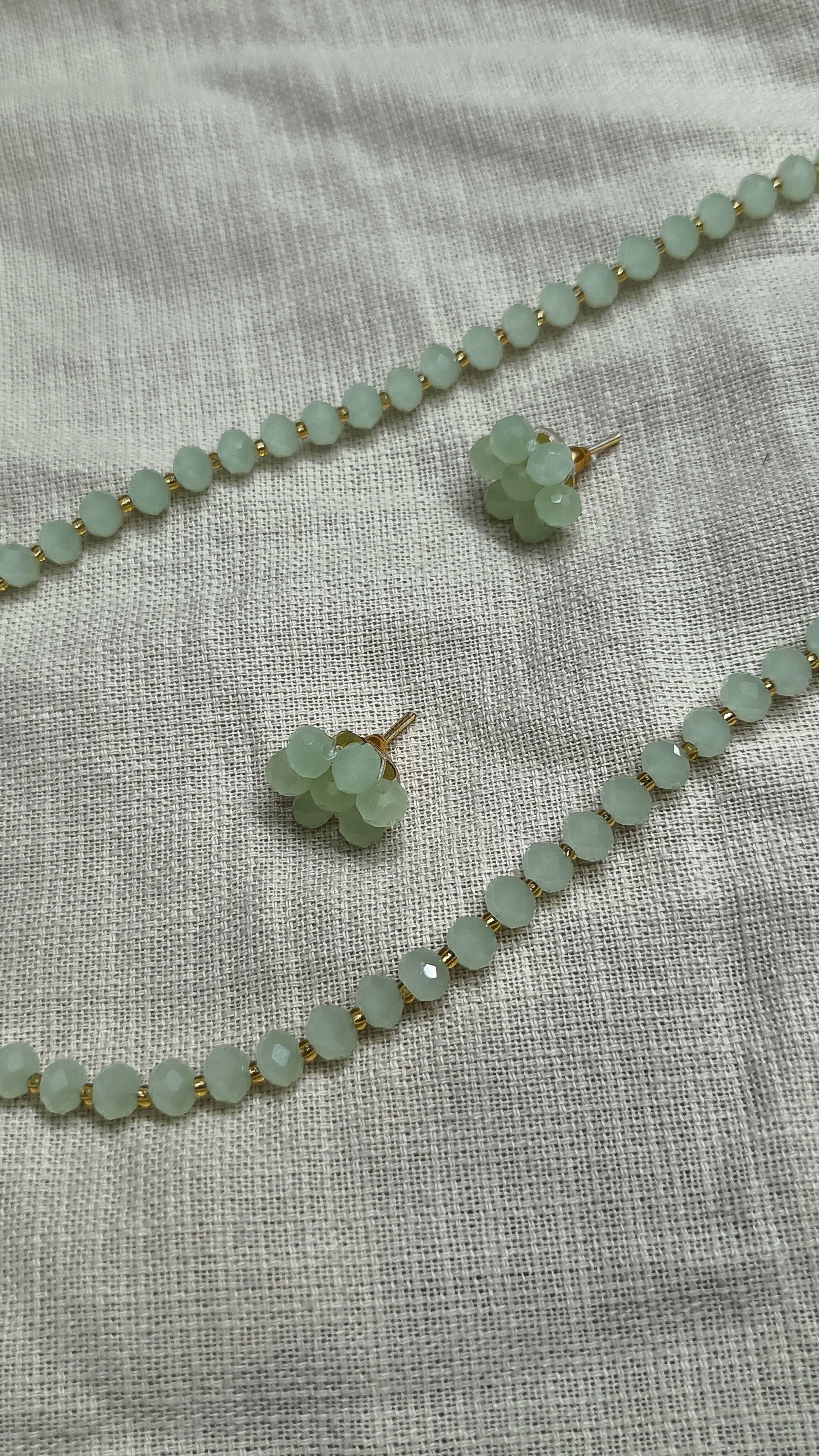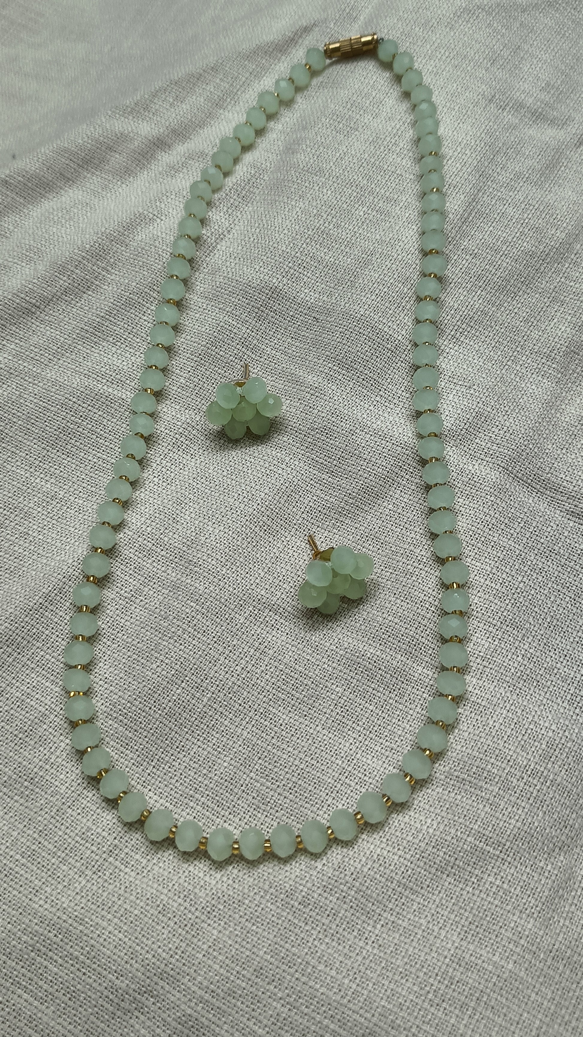 Add a touch of delicate charm to your look with this elegant jewelry set. The single-strand necklace features sparkling faceted beads in a serene, frosted mint green color that catches the light beautifully. Small golden spacers are nestled between each bead, adding a touch of classic elegance and warmth.