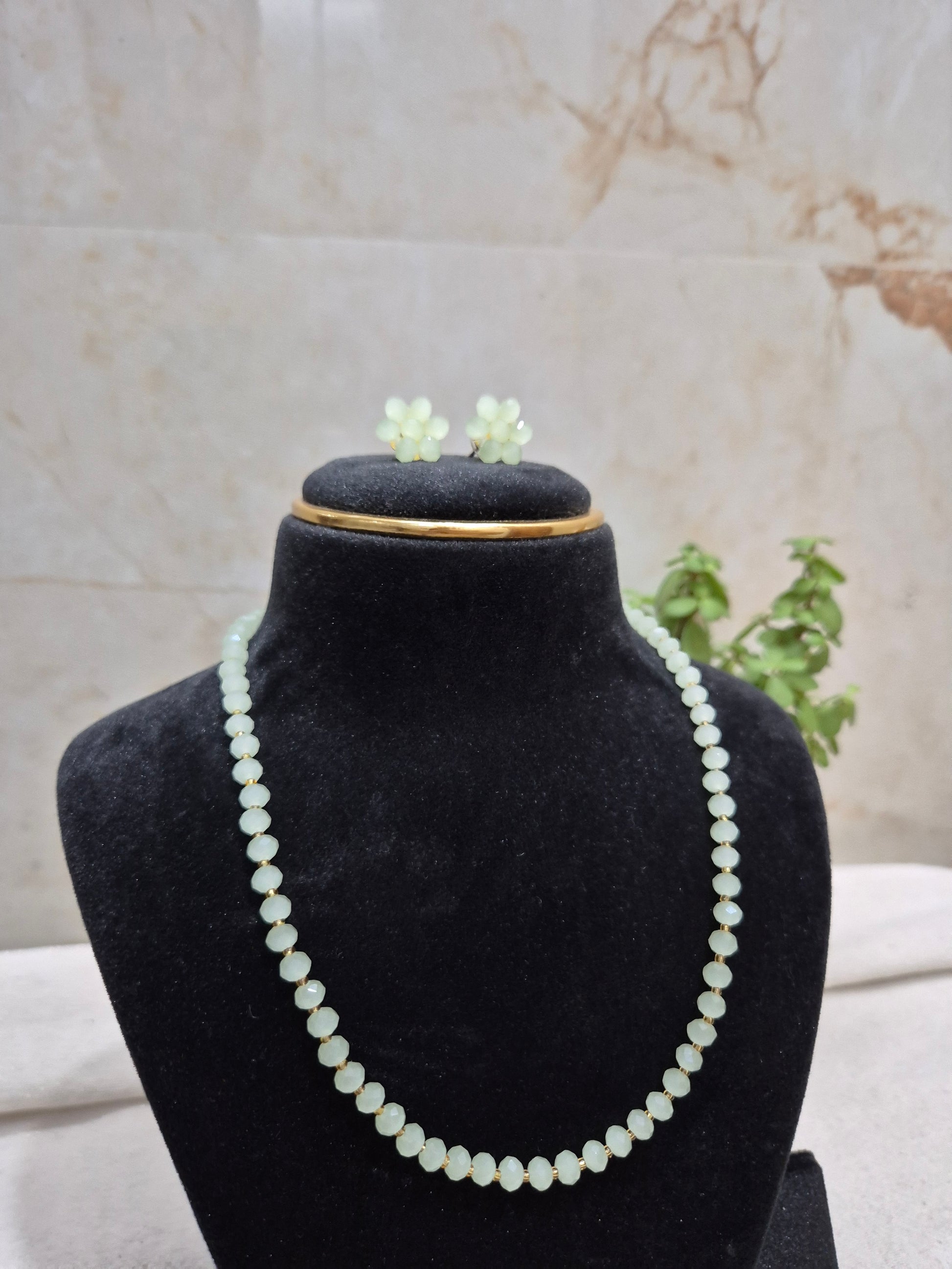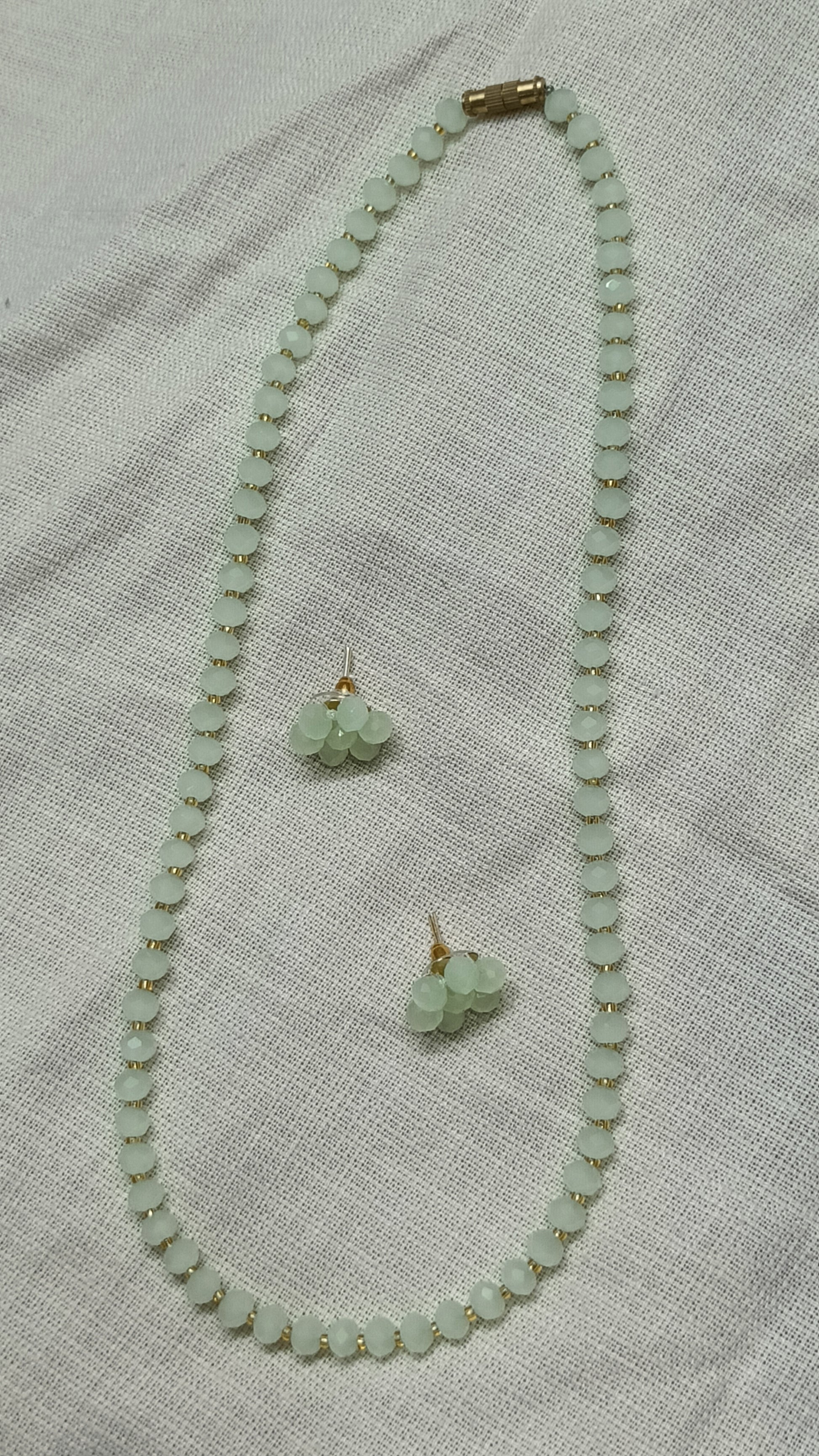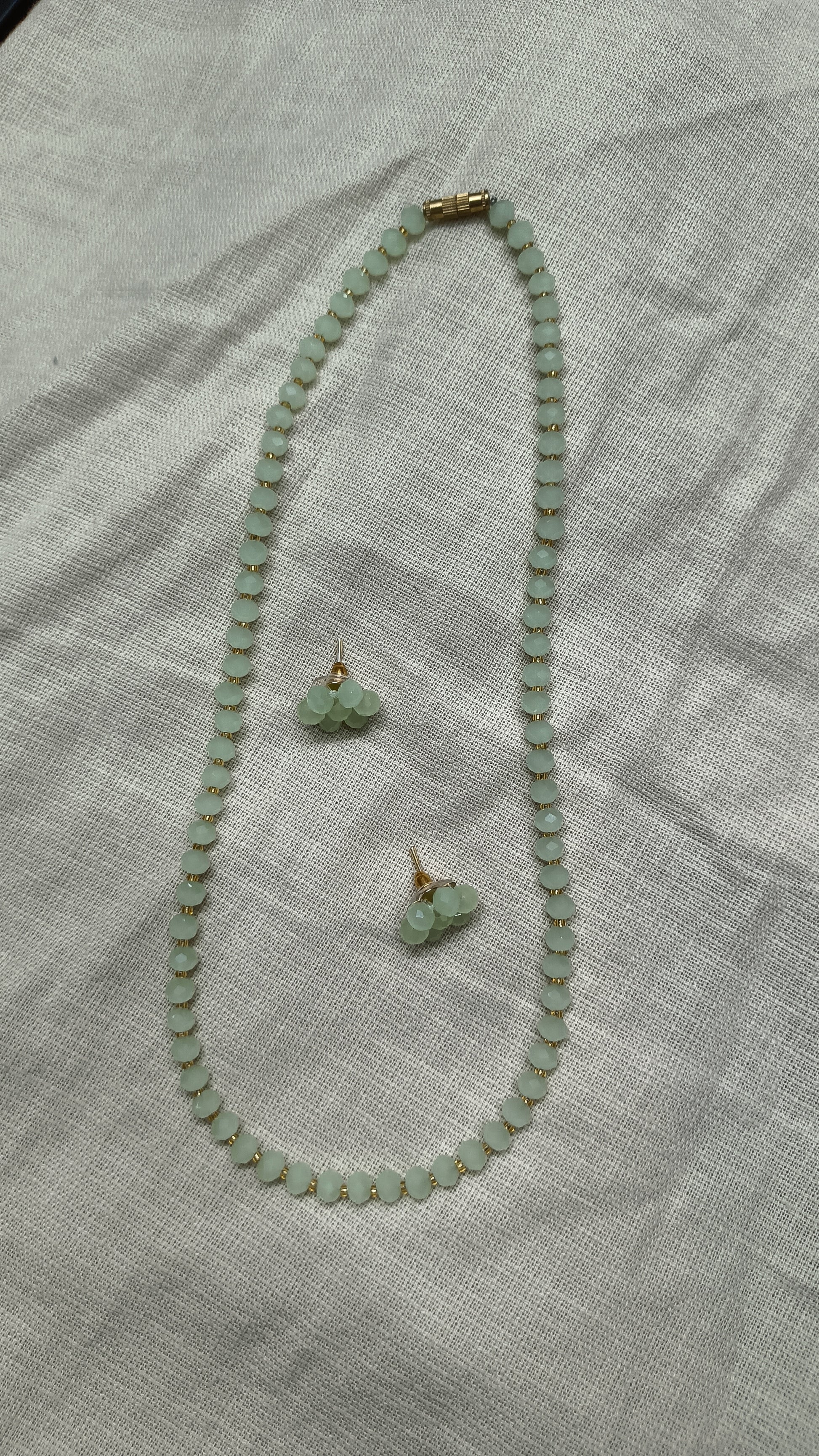 Add a touch of delicate charm to your look with this elegant jewelry set. The single-strand necklace features sparkling faceted beads in a serene, frosted mint green color that catches the light beautifully. Small golden spacers are nestled between each bead, adding a touch of classic elegance and warmth.