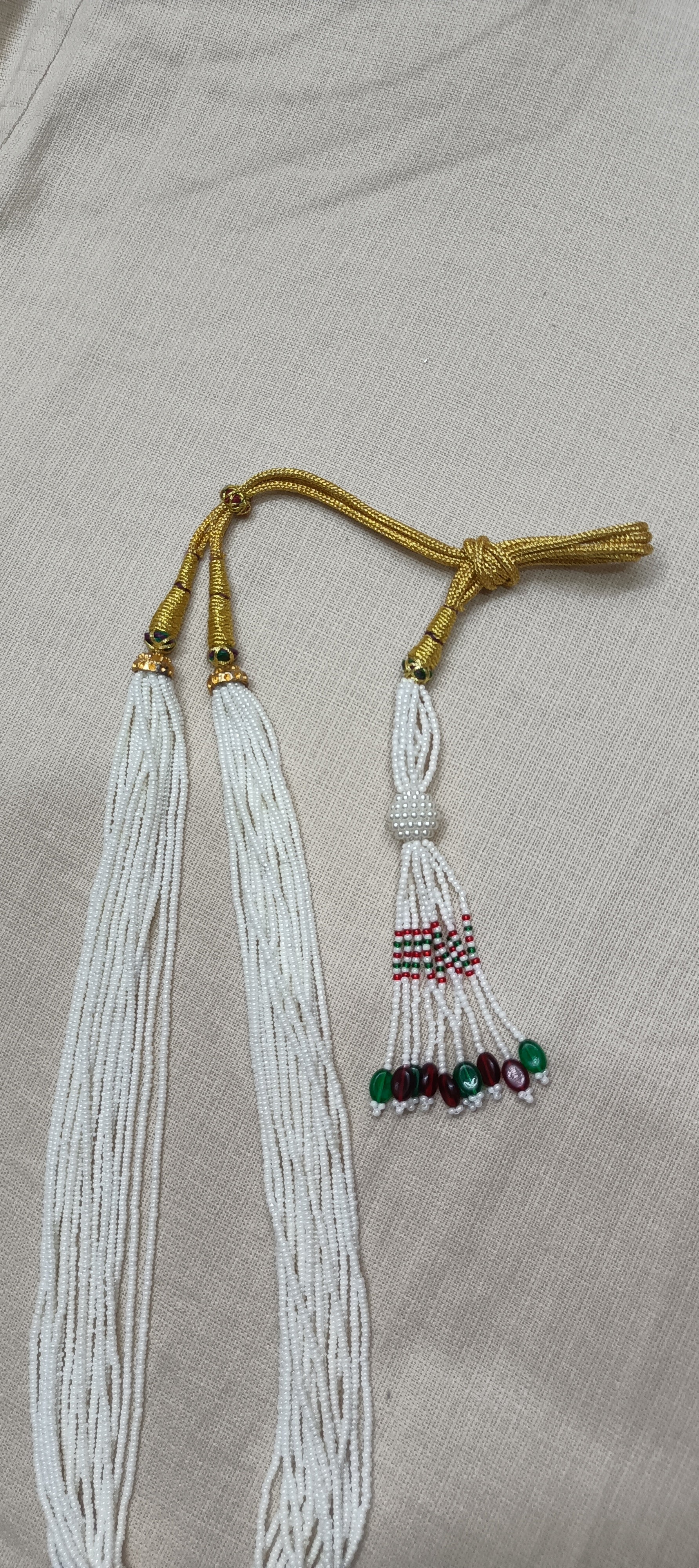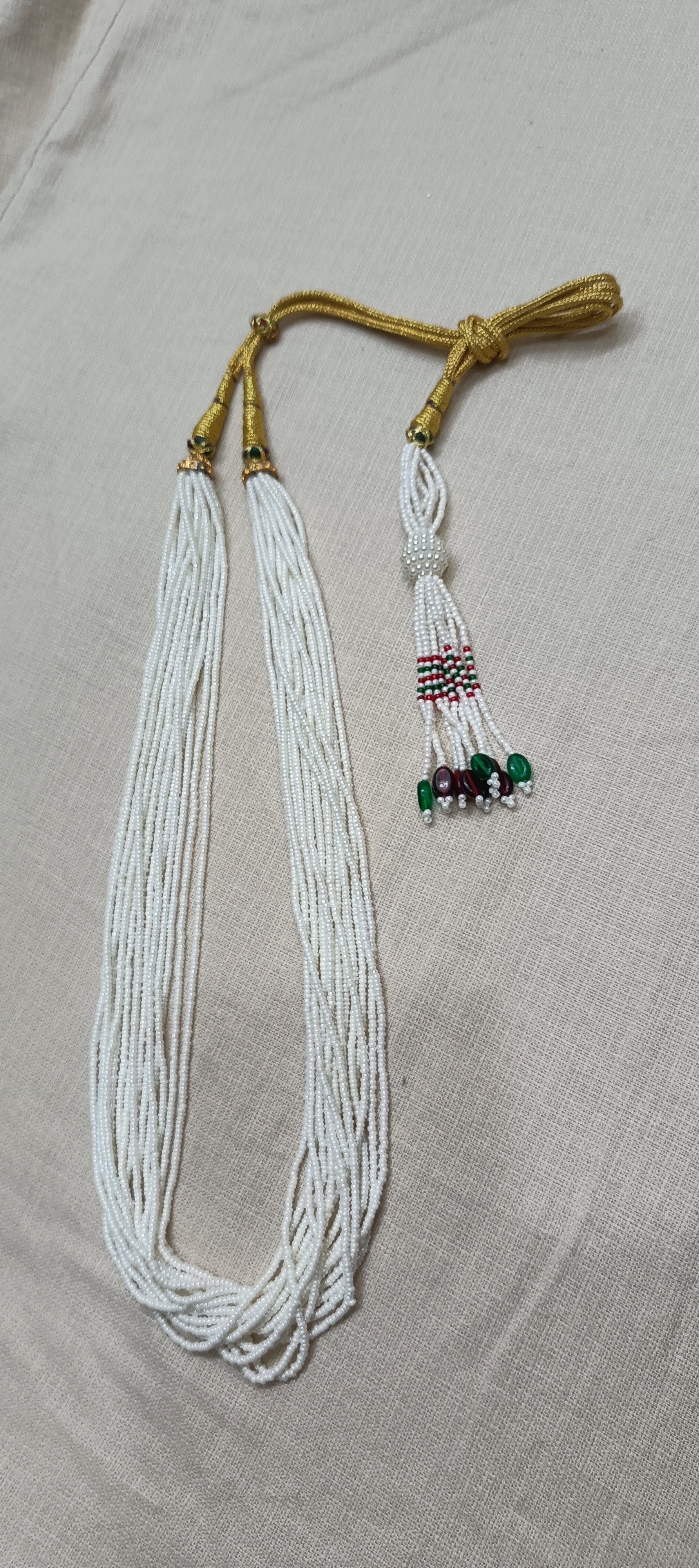 The necklace is elegantly finished with golden caps and an adjustable golden thread closure. A charming multi-colored tassel, adorned with white, red, and green beads, adds a vibrant and festive detail, making this piece truly unique. This versatile necklace is perfect for traditional wear, festive occasions, or to add a refined yet bohemian flair to your contemporary outfits.