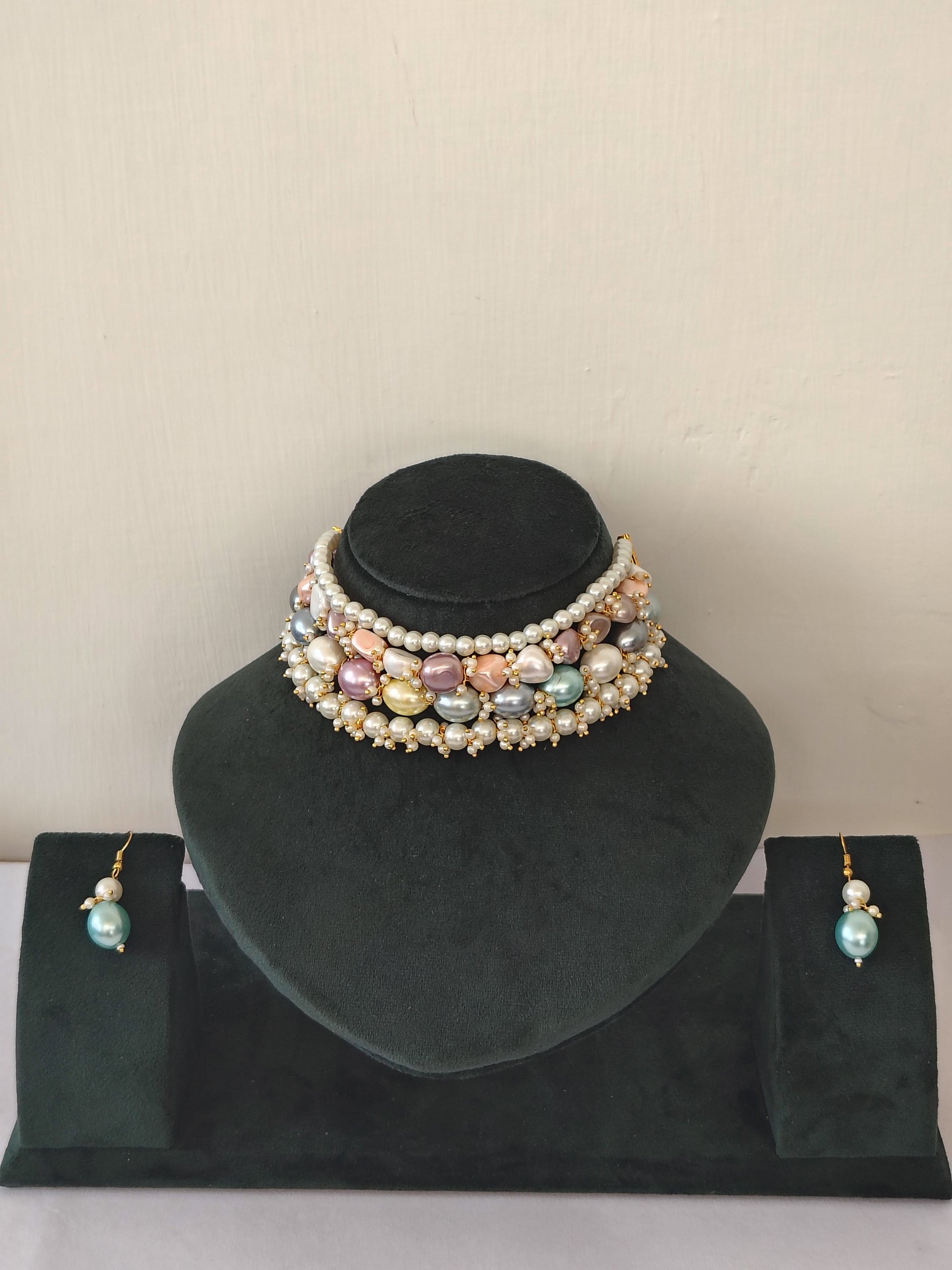 Royal Pearl Choker & Multi Strand Multi colour Jewellery Set With Maang Tikka With Earrings
