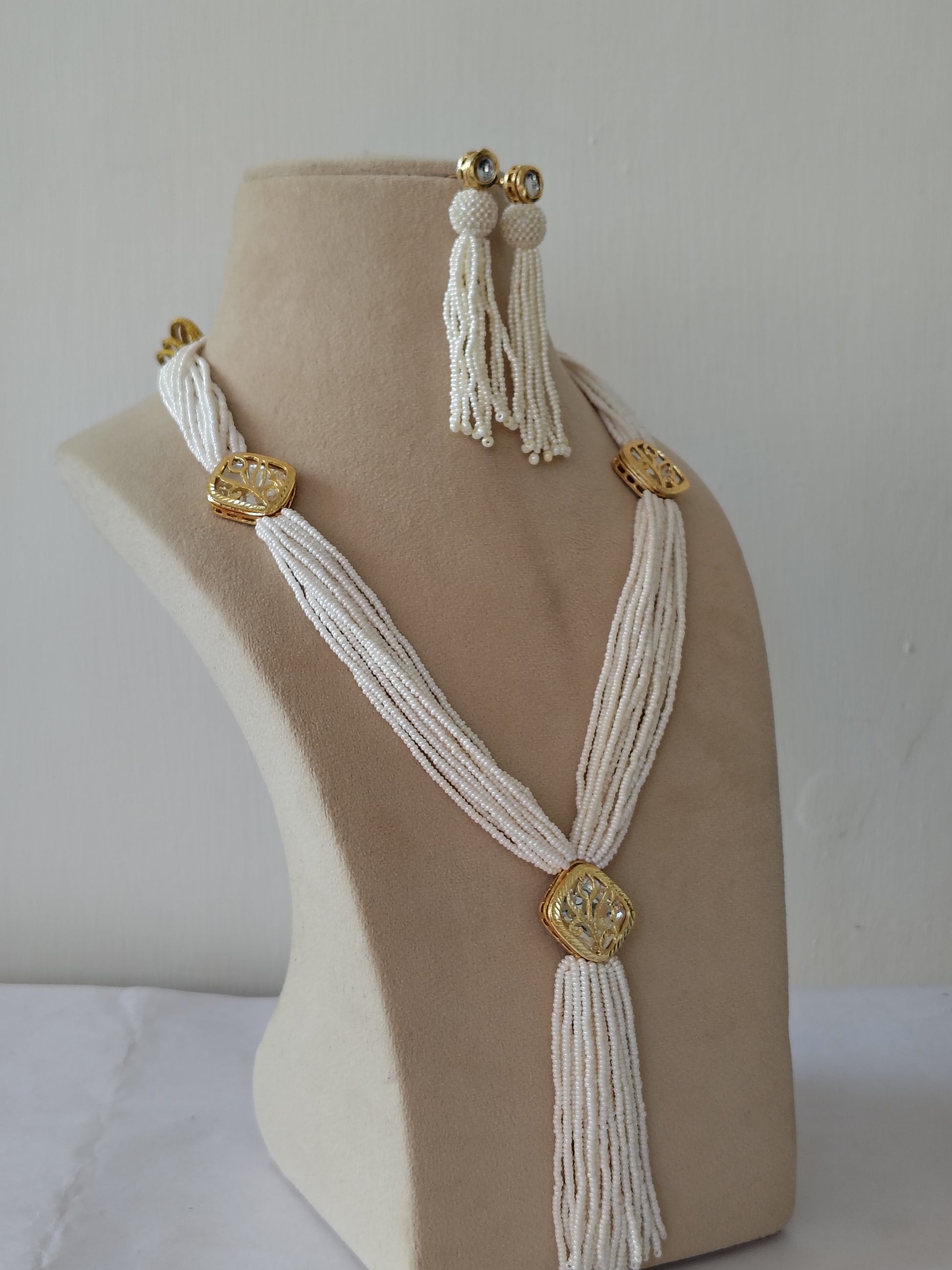 Imperial White Pearl Tassel & Gold Filigree Set & Matching Earrings