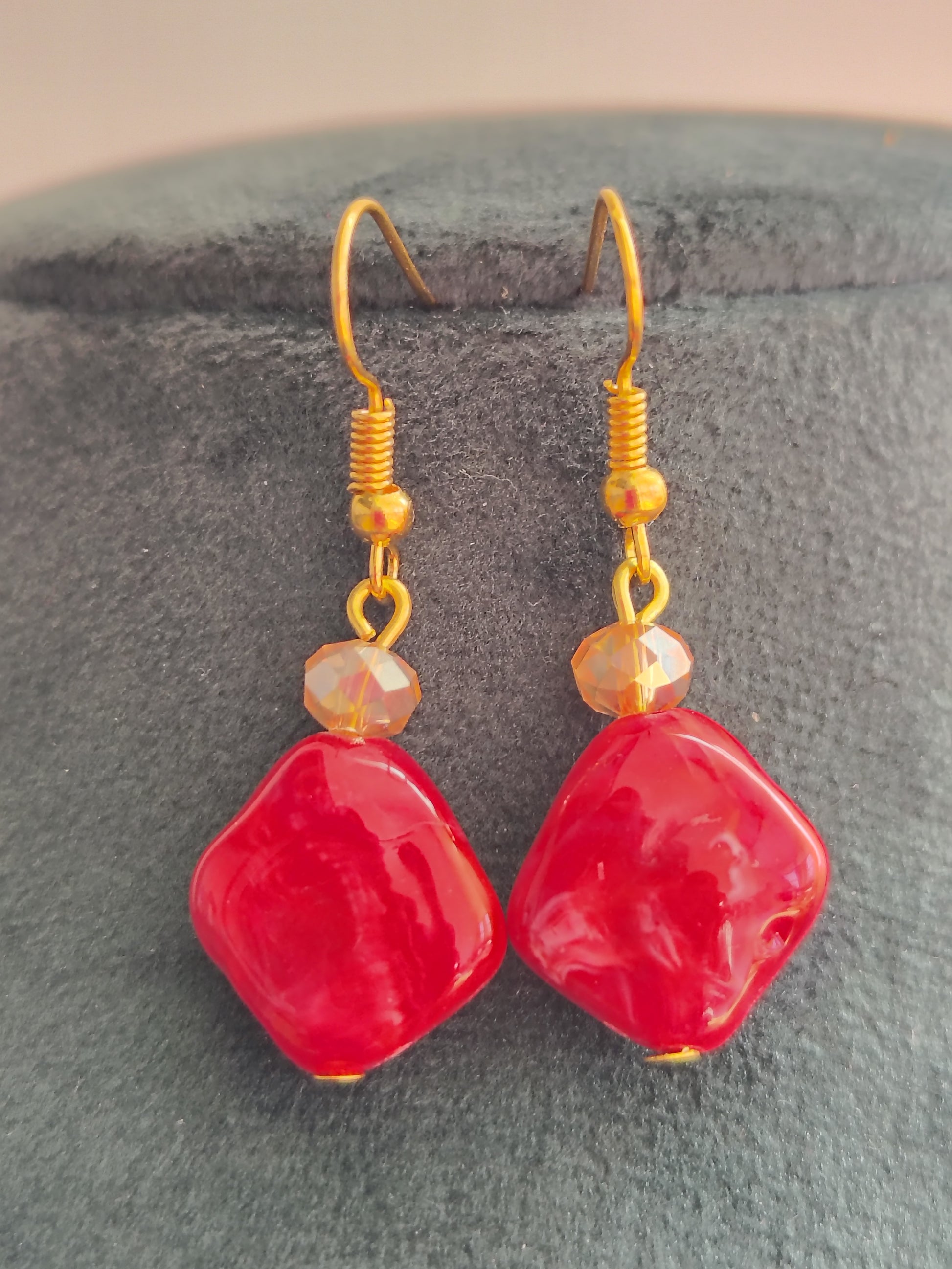 Necklace Set Red White Pearls With Golden Metal Earrings