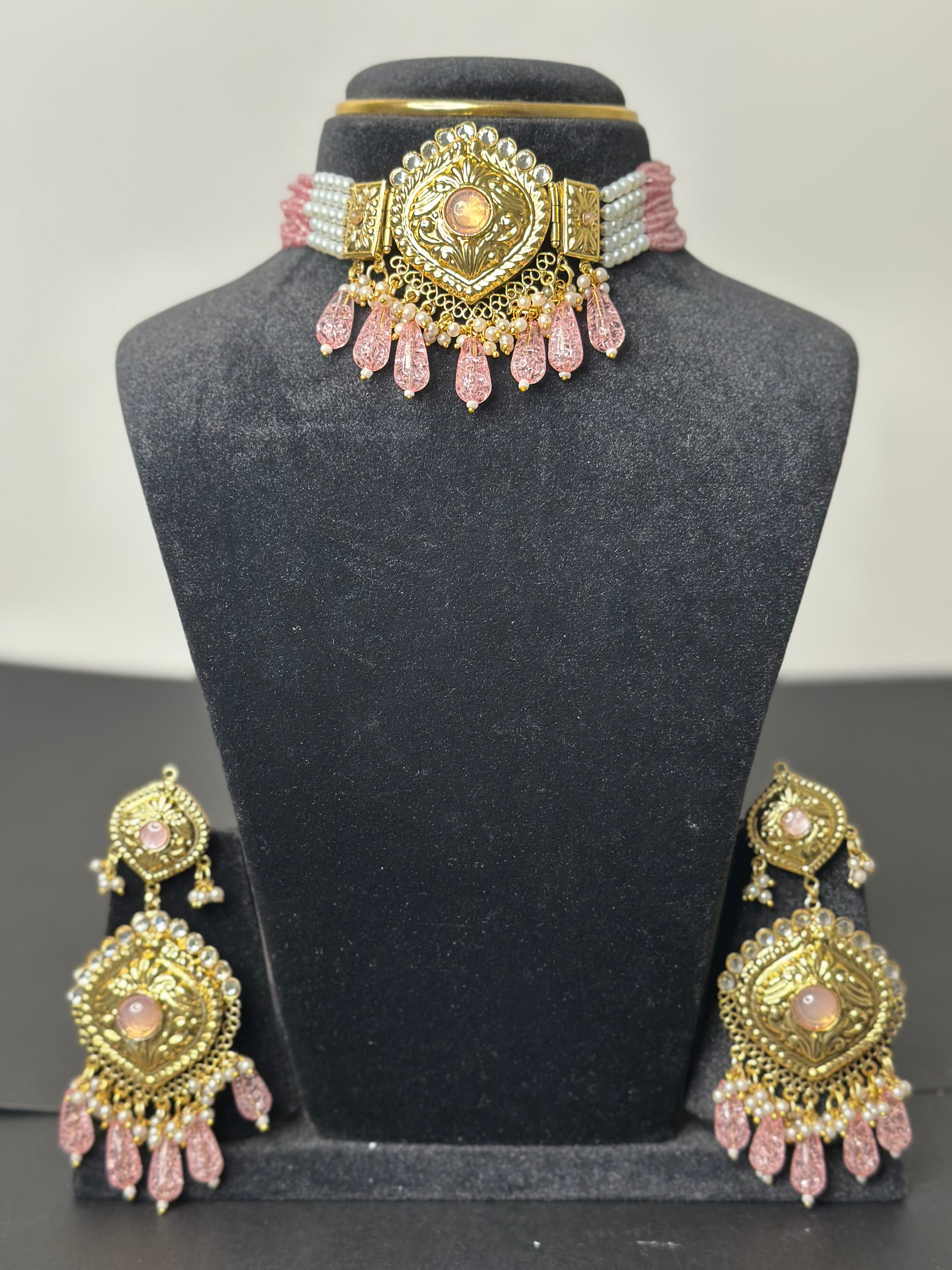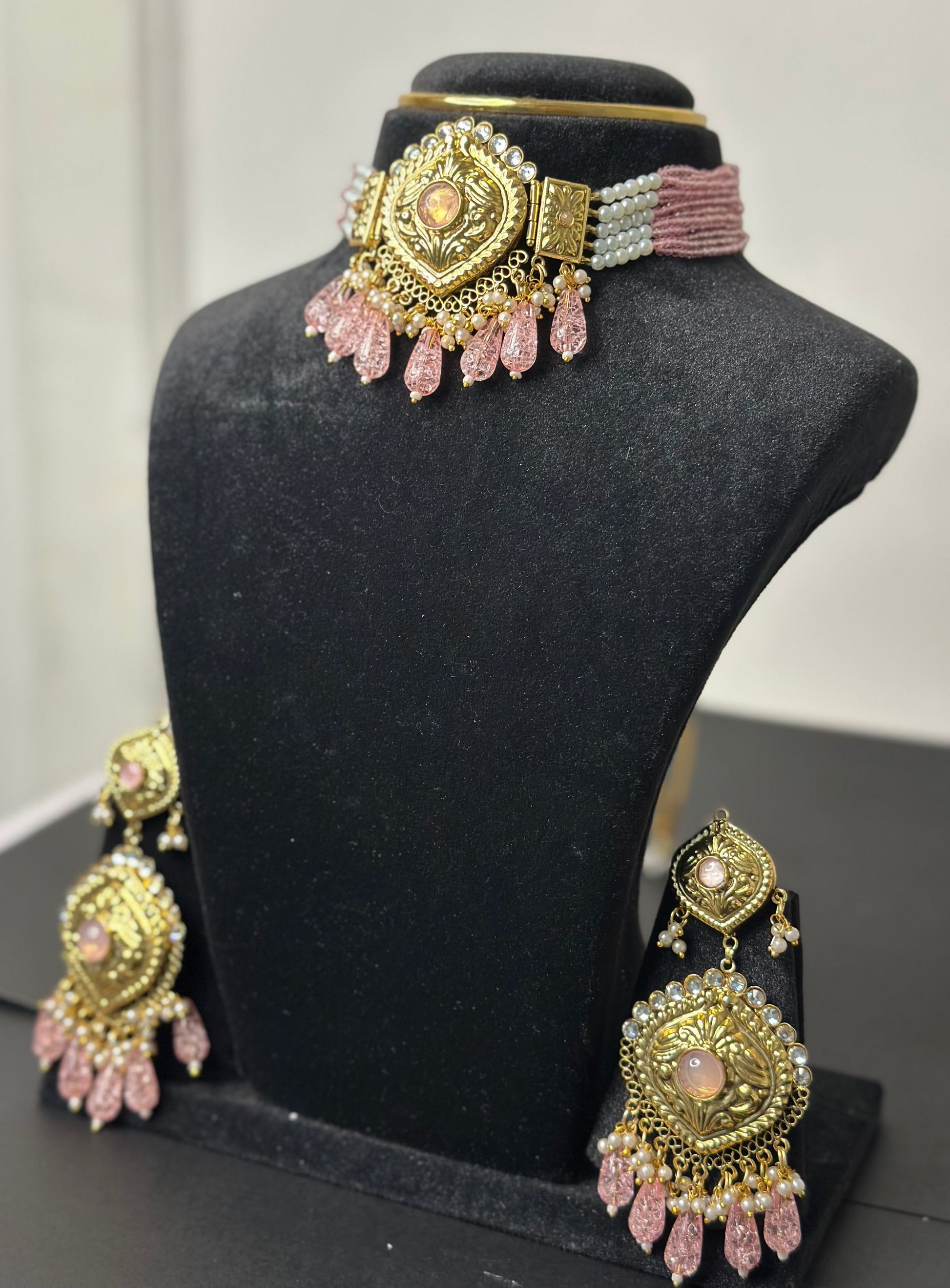 Bright Pink Pearl 3 Layer With Earrings Chokar Set