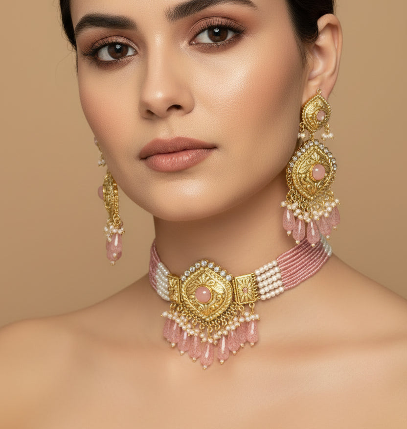 Royal Punjabi Necklace in Golden and Pink with Earrings and Mang Tikka