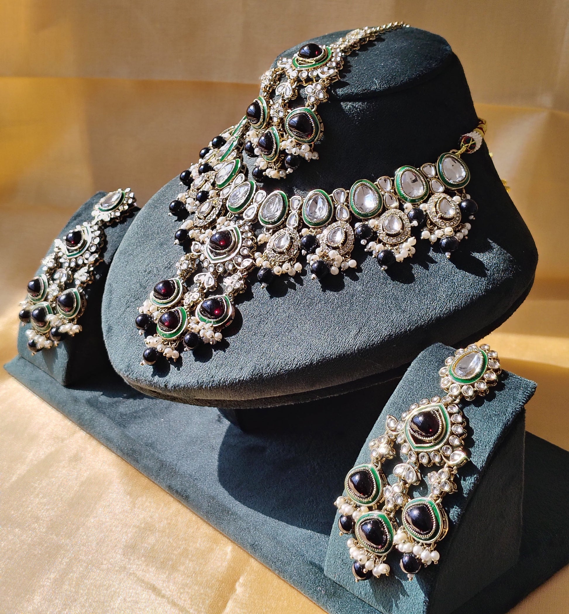 Royal Emerald & Kundan Necklace Set – Grand Bridal Choker with Maang Tikka & Earrings