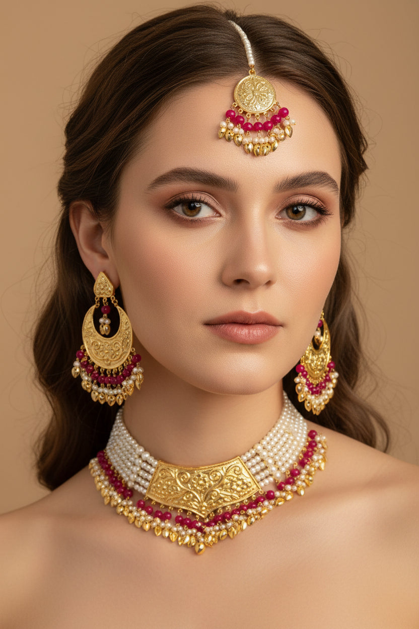Royal Punjabi Necklace in Golden and Pink with Earrings and Mang Tikka