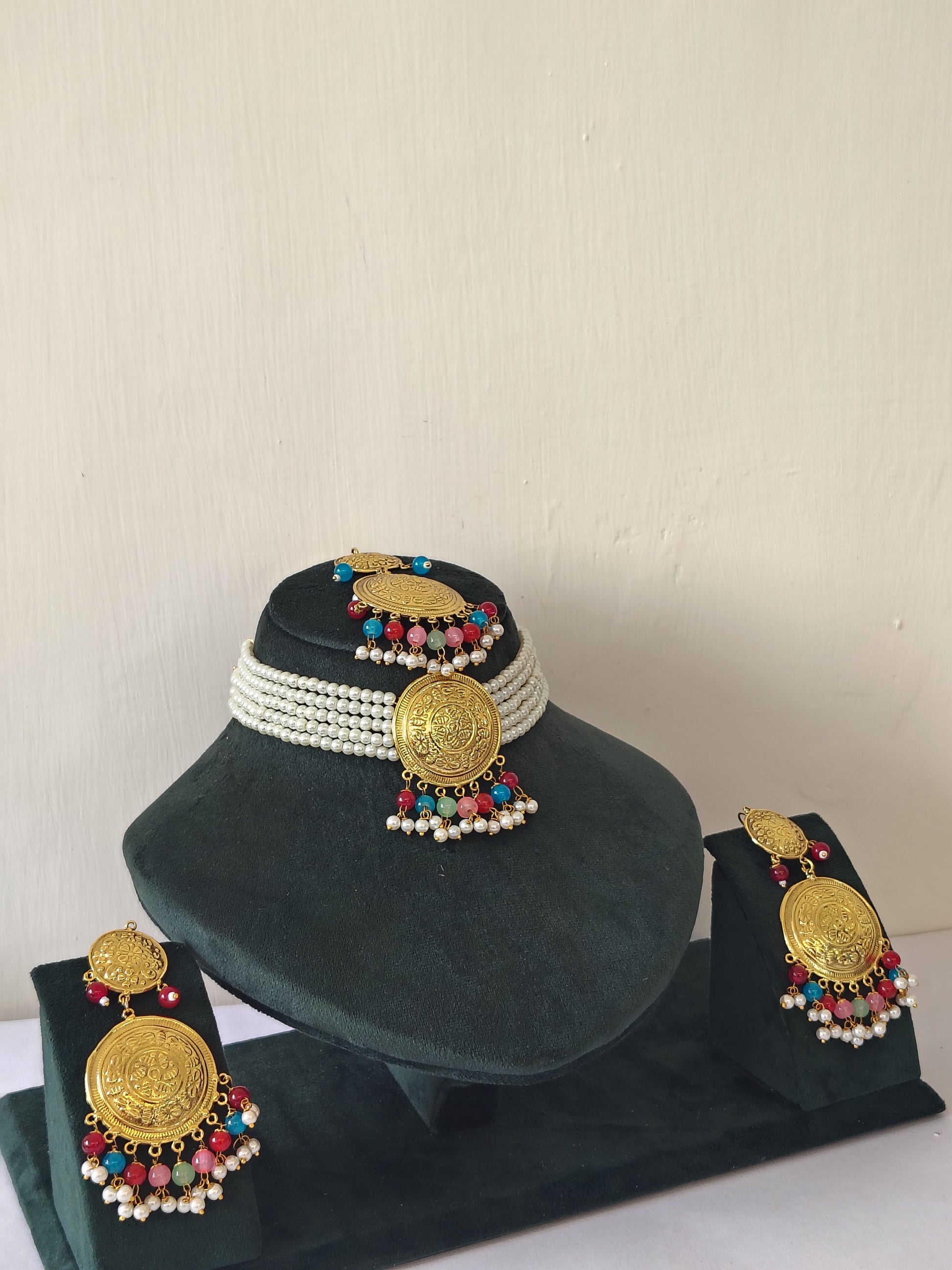 Royal Pearl Choker & Multi Strand Multi colour Jewellery Set With Maang Tikka With Earrings