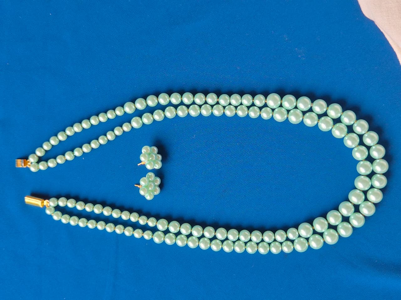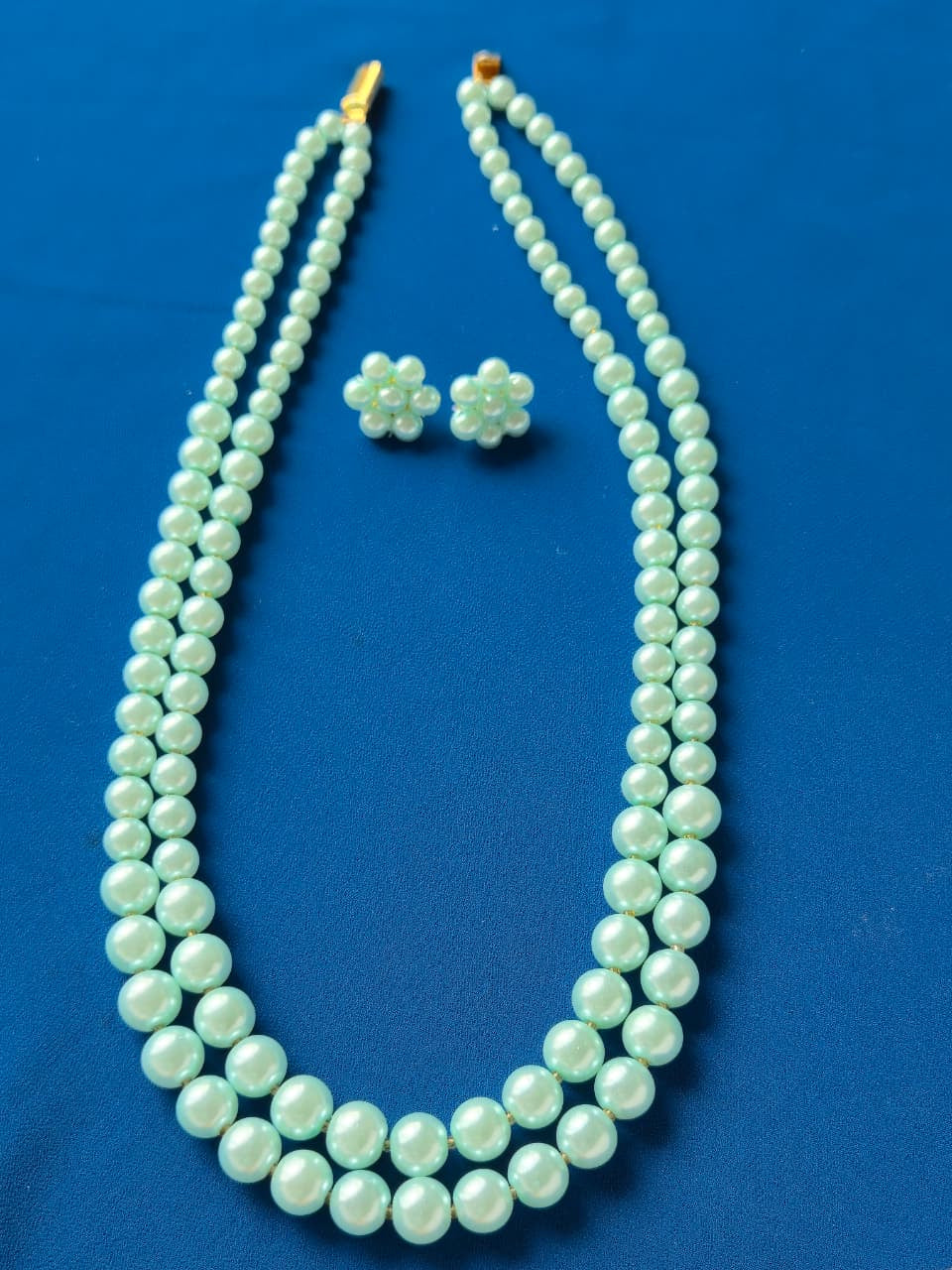 Embrace a look of delicate sophistication with this stunning two-strand pearl jewelry set in a beautiful sky-blue hue. The necklace features two perfectly aligned strands of lustrous, light blue simulated pearls, creating a graceful and elegant double-strand design. The pearls in the inner strand are slightly smaller than the ones in the outer strand, providing a subtle gradient and a rich, layered effect.